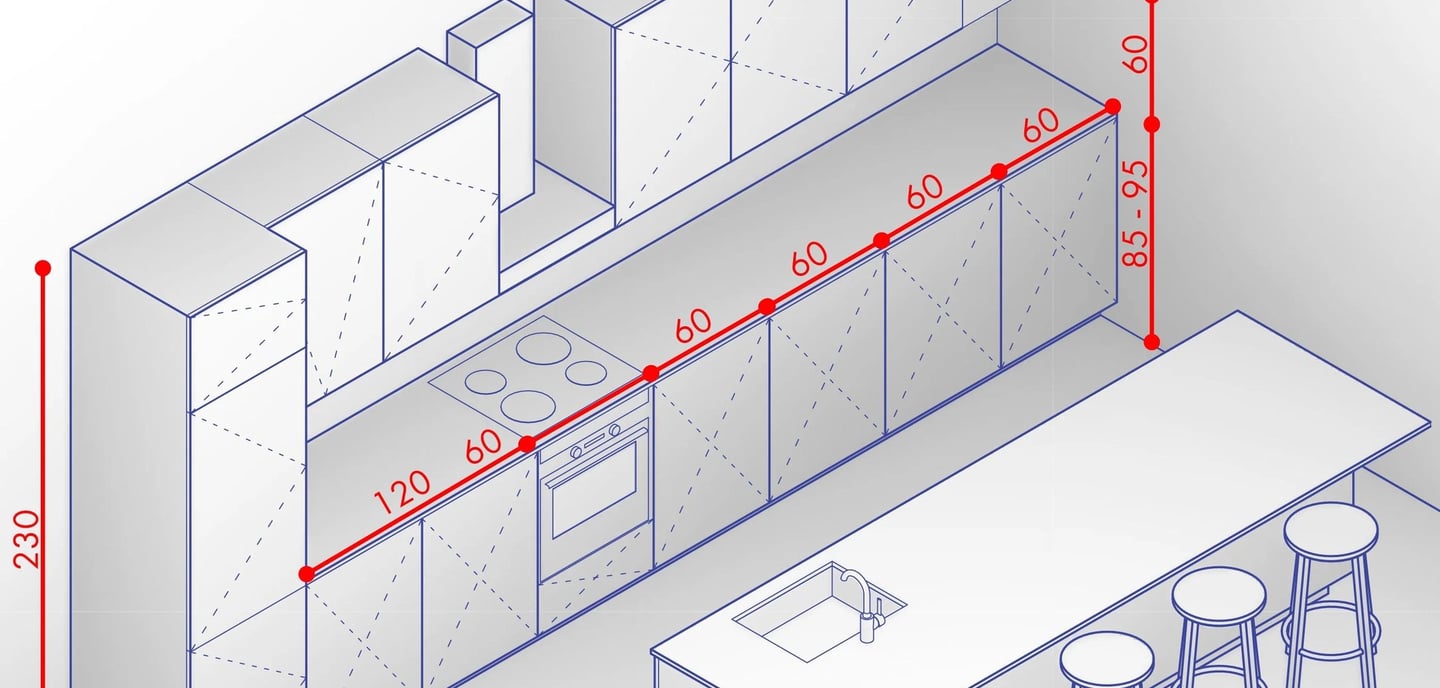 Minimalna szerokość przejścia między szafkami lub wyspą: 90 cm – to absolutne minimum, które pozwala jednej osobie swobodnie się poruszać.
