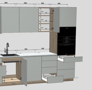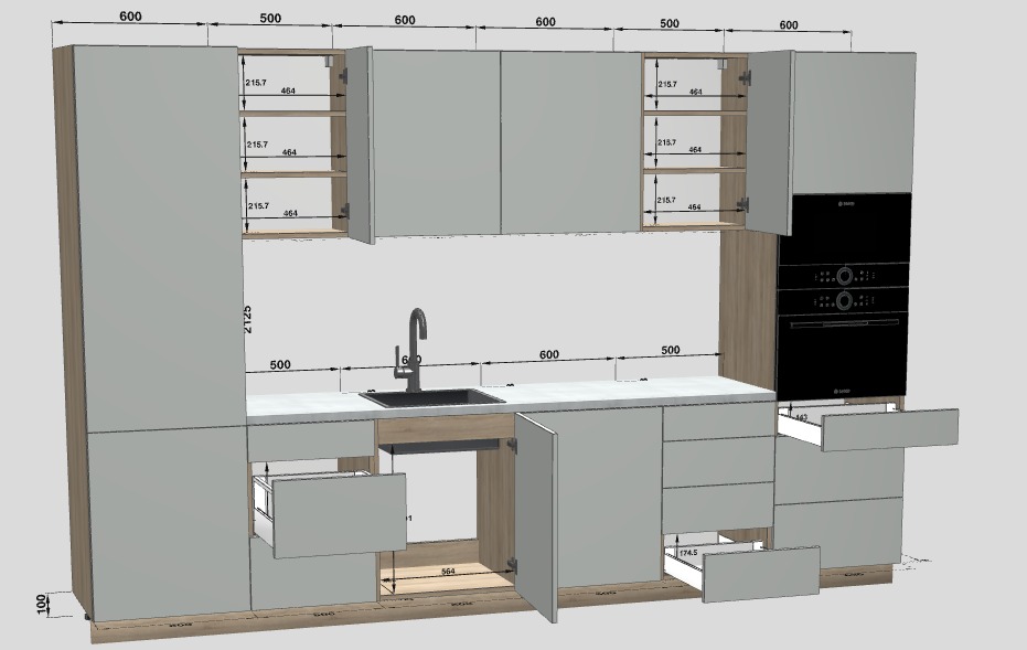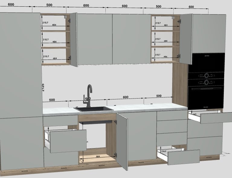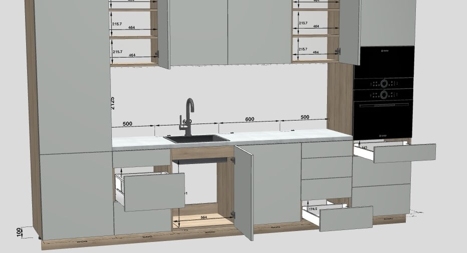 dobierać dokładne wymiary każdego modułu (np. szafki, blatu, korpusu),