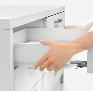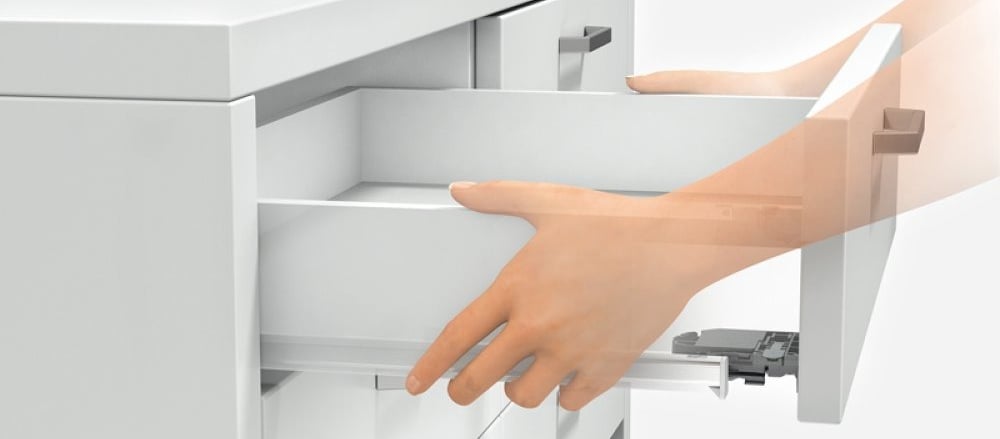W przypadku szuflad najwygodniejszym i najbardziej zaawansowanym rozwiązaniem są prowadnice zintegrowane z systemem tłumienia. Zapewniają: