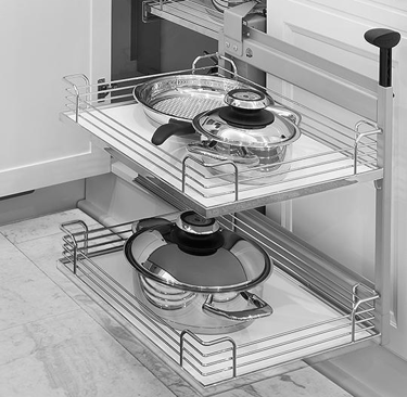 To system obrotowo-wysuwny, który podczas otwierania drzwi "wyciąga" dwa niezależne segmenty koszy: pierwszy wychodzi na zewnątrz, drugi automatycznie przesuwa się na jego miejsce z głębi szafki. Dzięki temu użytkownik zyskuje pełen dostęp do całej zawartości – bez konieczności schylania się czy sięgania w głąb.