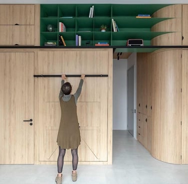 w niewielkich lokalach taka zabudowa może przejmować funkcję wielu mebli jednocześnie: szafy, regału, schowka, garderoby, a nawet ukrytej kuchni.